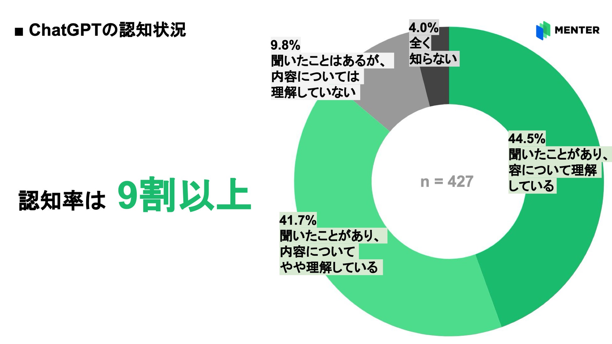 ChatGPTの認知状況については「聞いたことはあるが、内容については理解していない」「聞いたことがあり、内容についてやや理解している 」「聞いたことがあり、内容について理解している」の合計は96%となり、認知率そのものは高いことがわかりました。「聞いたことがあり、内容について理解している」という深い認知は4割存在する結果となりました。