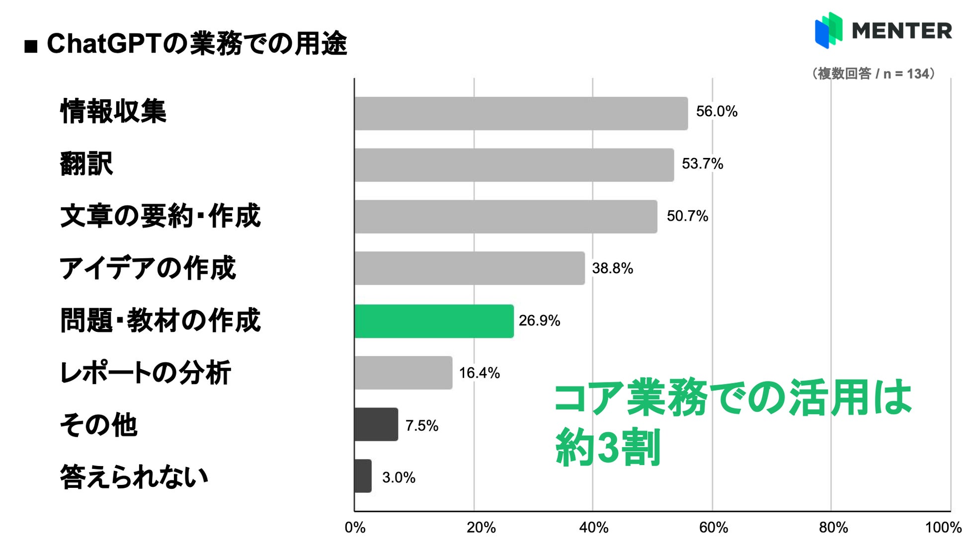 ChatGPTを業務で活用している人にその用途を尋ねたところ、1位は「情報収集」(56.0%)。ついで「翻訳」(53.7%)、「文書の要約・生成」(50.7%)とそれぞれ半数近くが回答。4割程度が「アイデアの生成」で活用していることがわかりました。一方で、教員のコア業務である「問題・教材の作成」に活用している割合は26.9%でした。