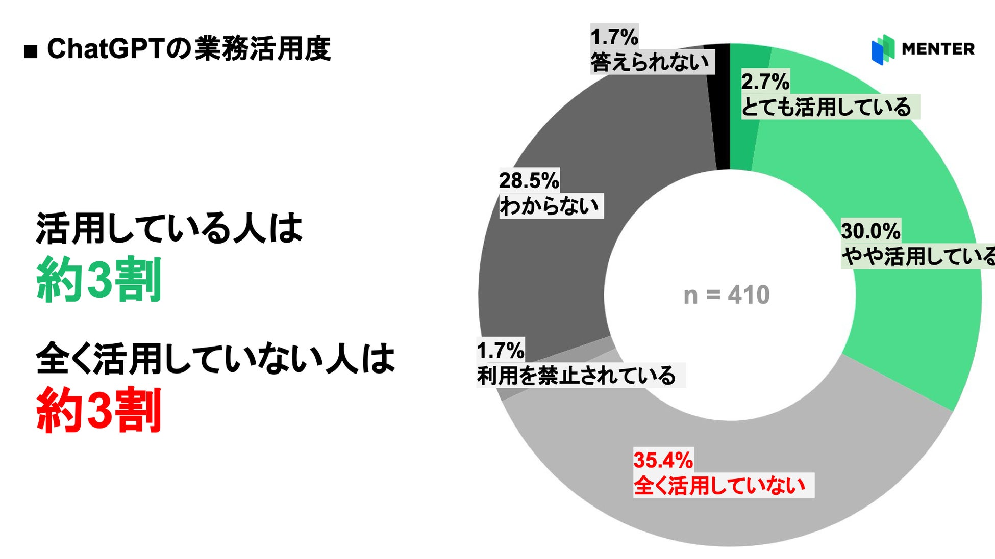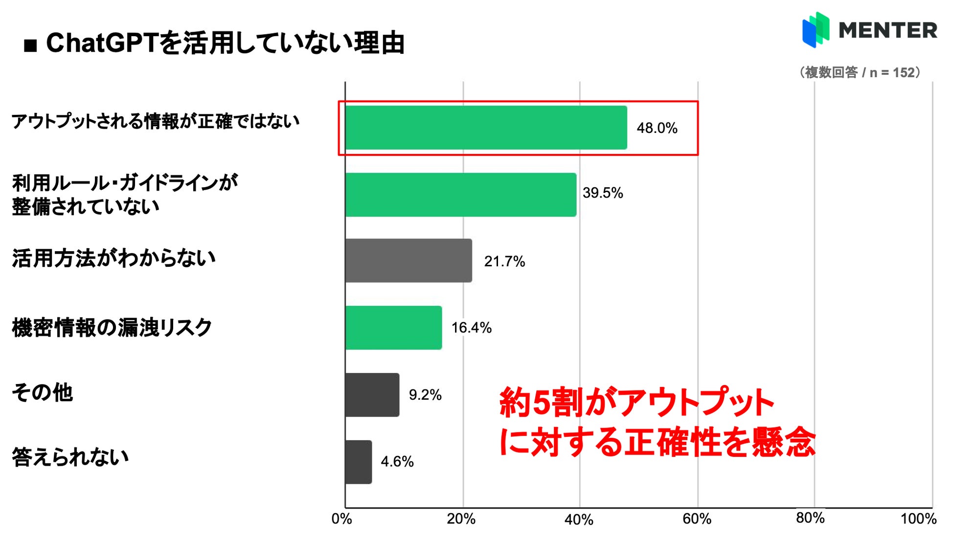 ChatGPTを活用してない/禁止されていると回答した方にその理由を尋ねた結果、「アウトプットされる情報が正確ではない」からが最も多く48.0%。ついで「利用ルール・ガイドラインが整備されていない」が39.5%。「活用方法がわからない」人は約2割。機密情報の漏洩リスクを懸念する人は16.7%。主に安全面に配慮し活用がスタートしていない状況であることがみてとれます。