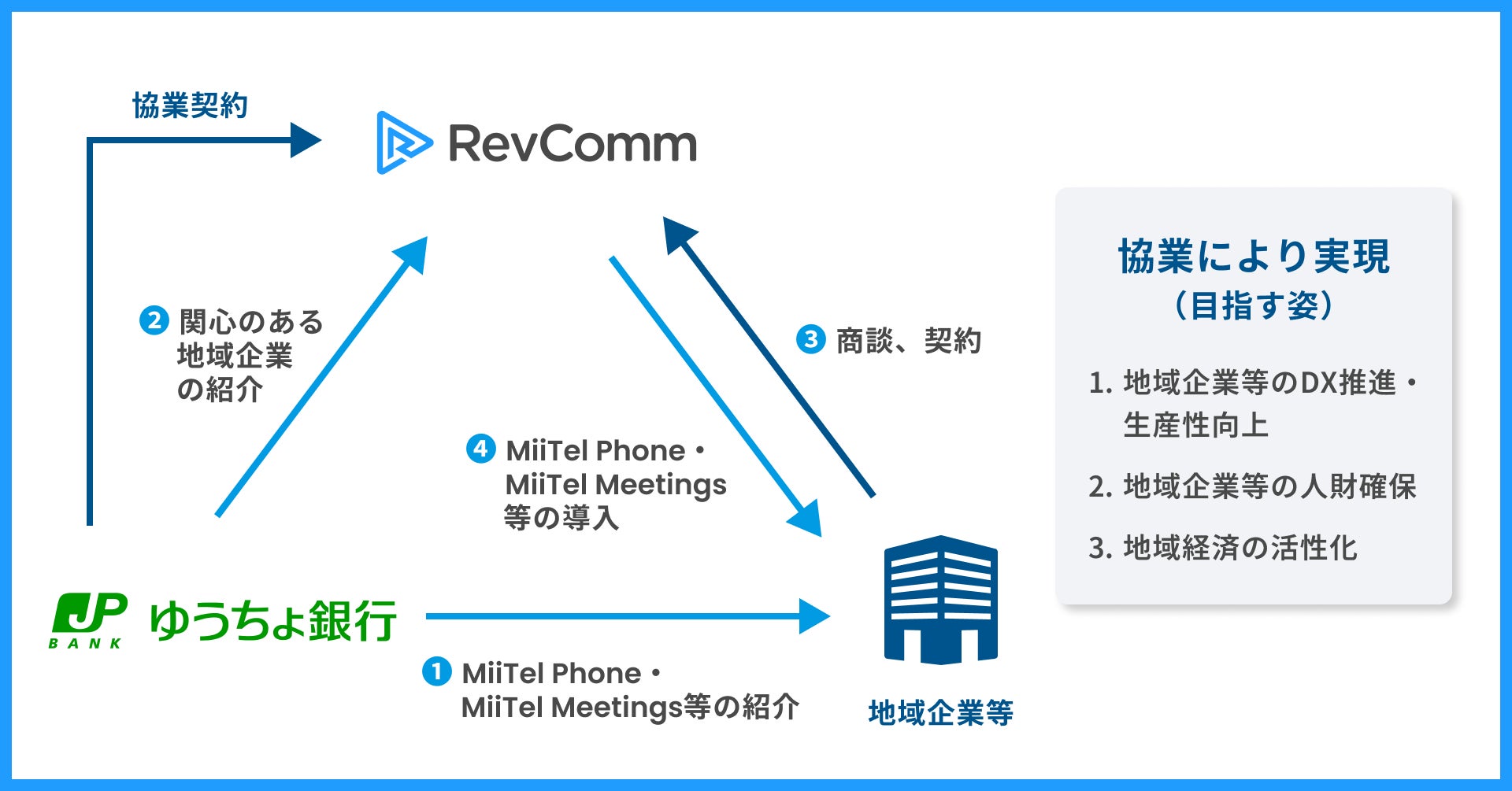 ゆうちょ銀行は、本協業にてレブコムが提供するAI(人工知能)搭載型のクラウドIP電話「MiiTel Phone(ミーテルフォン)」やオンライン商談システム「MiiTel Meetings(ミーテルミーティング)」等を、インサイドセールス(電話やオンライン面談システムを用いた内勤営業)の効率化や人財の定着等に課題を持つ地域企業に対して、紹介を行っていきます。
