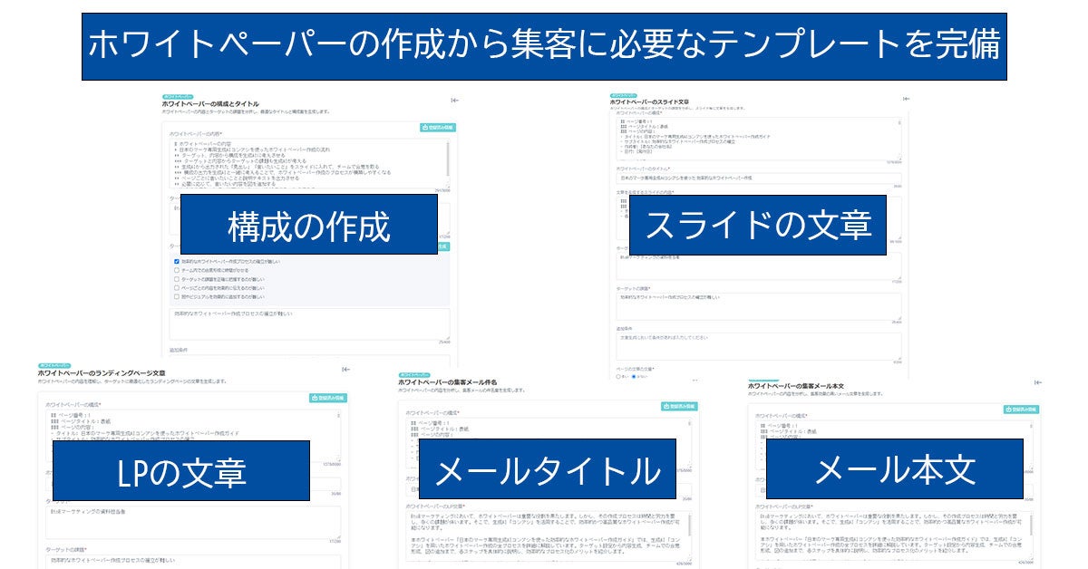 ホワイトペーパーの構成とタイトルとターゲット、ターゲットの課題を入力することで、AIがホワイトペーパーの内容を理解し、ターゲットに最適化したランディングページの文章を生成します。
