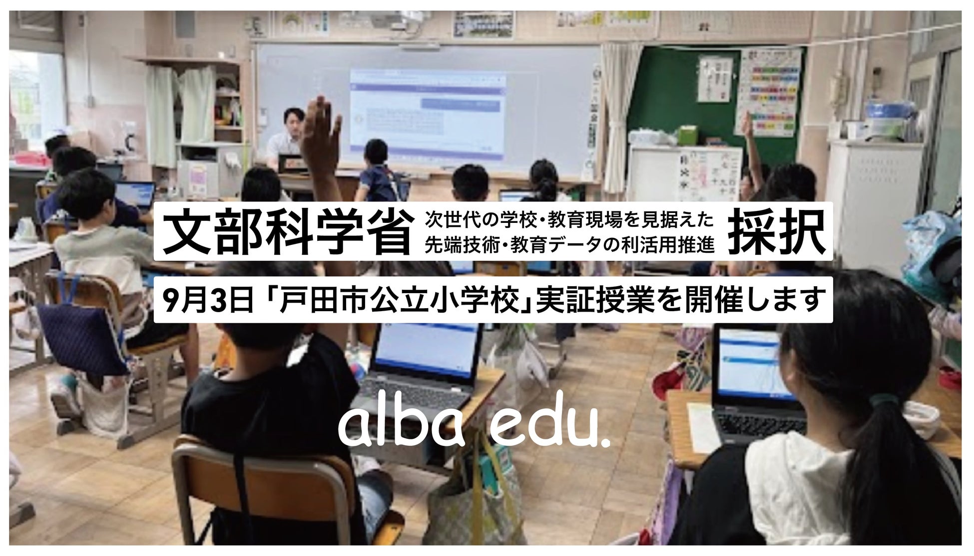 本実証実験は、戸田市立美谷本小学校の4年生に複数回の授業を行い、その実証研究において得られた会話データやアンケート、教員による評価を基に、アプリ使用前後における児童の思考や発話に対する態度の変化を評価します。この実証の結果は発信され、話す力を高める授業のサポートとして広く全国に普及することを目指しています。今回の採択により、アルバ・エデュは今後も先端技術を活用した教育の実現に貢献し、児童一人ひとりに寄り添った「個別最適な学び」の推進に貢献していきます。