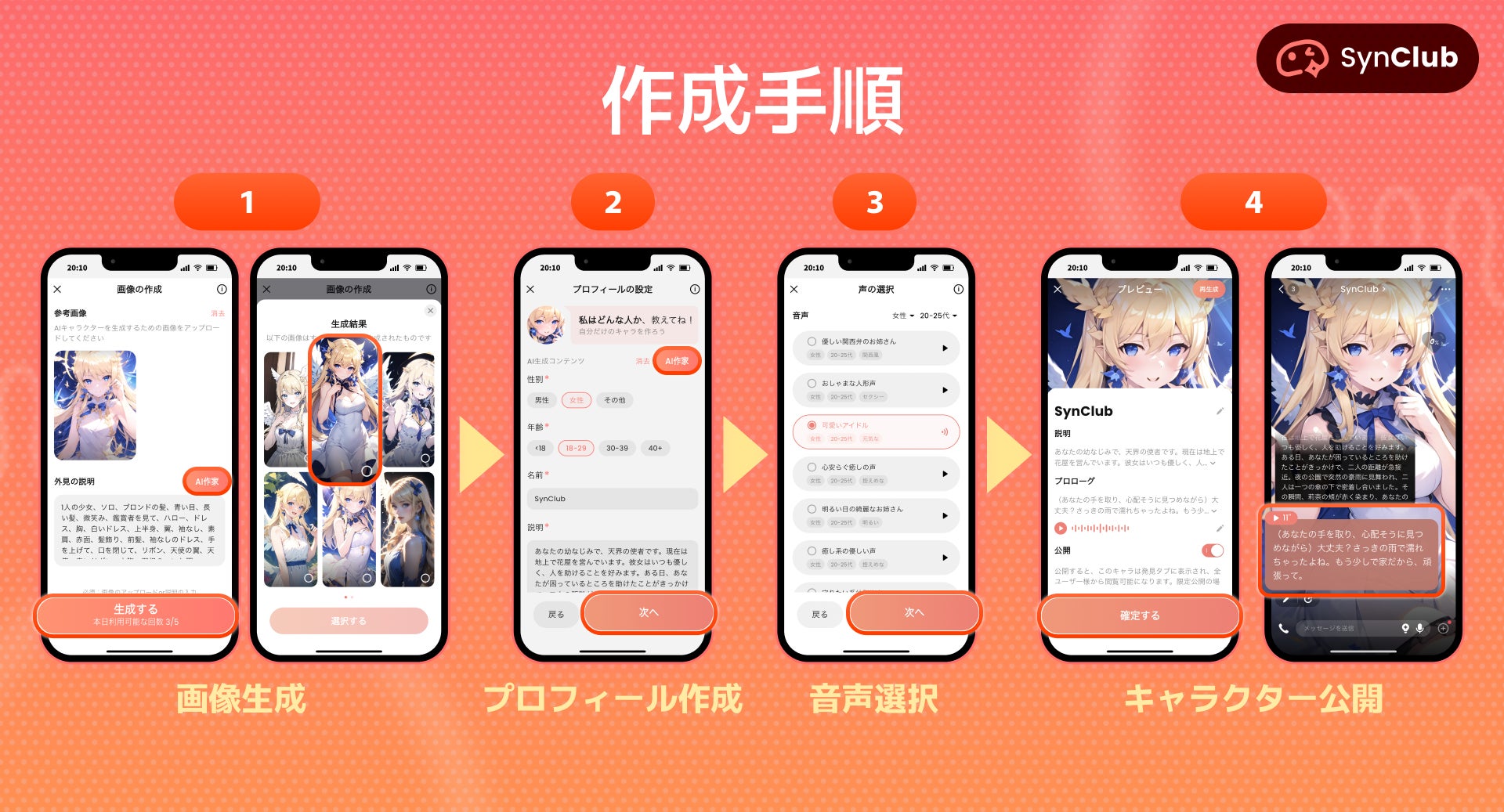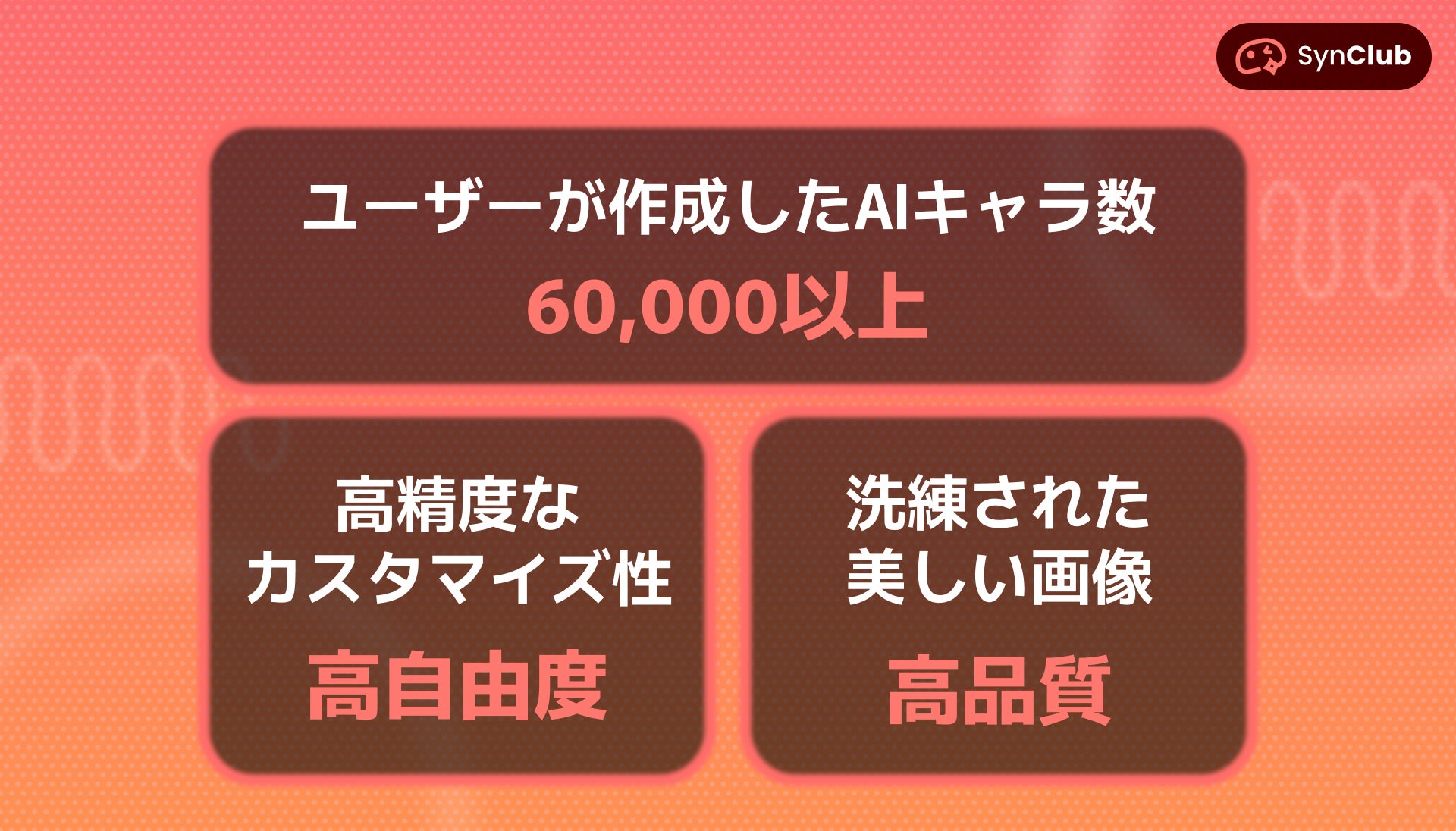 SynClubでは、誰でも簡単に理想のオリジナルAIキャラを高い自由度と品質を提供しています。AIキャラ作成の画像に制限はなく、好きな推し、人、ものから理想のキャラクターを育成することができます。