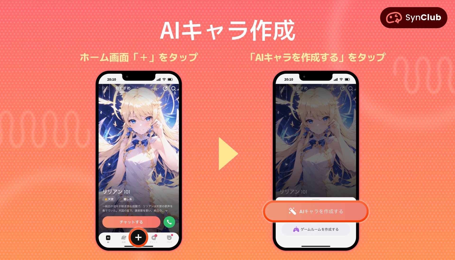 「SynClub」アプリを開き、「+」タブをタップし、「AIキャラを作成する」をタップ。