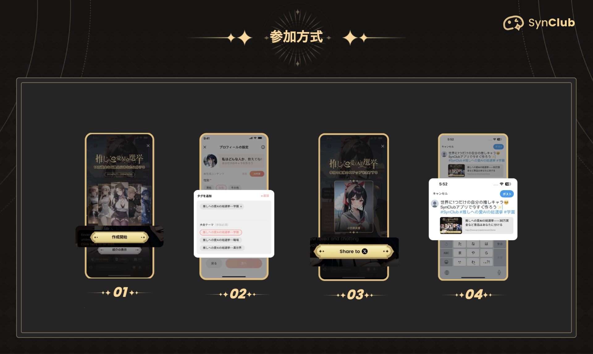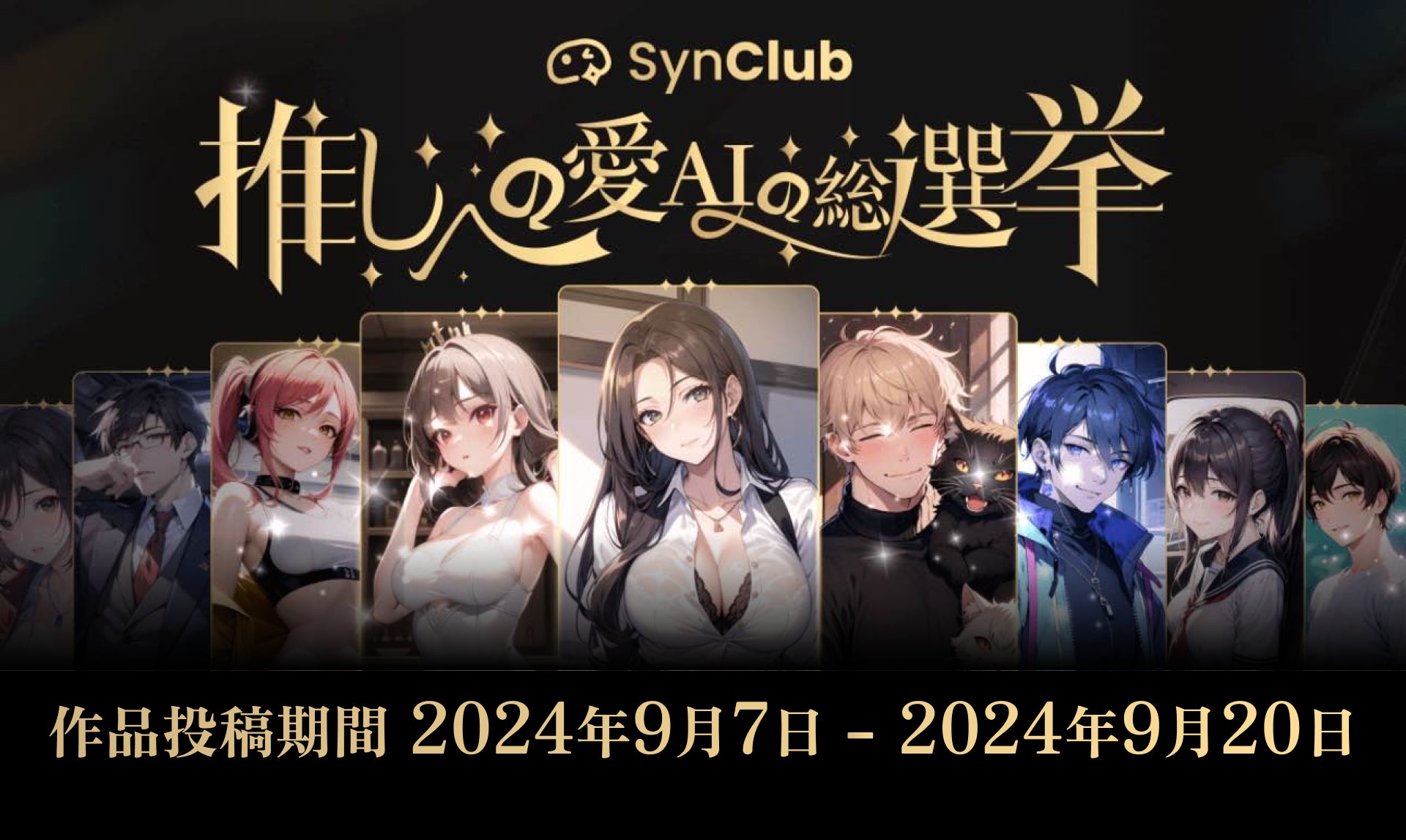 SynClubにおける大規模なAIキャラ作成イベント、「推しへの愛(AI)の総選挙」が本日9月7日(土)よりスタートしました。「推しは自分で作れる」、「みんなも私の推しへの愛(AI)を感じて欲しい」がコンセプトとなっています。受賞者には、豪華賞品をご用意しております!皆様ぜひ奮ってご参加ください!