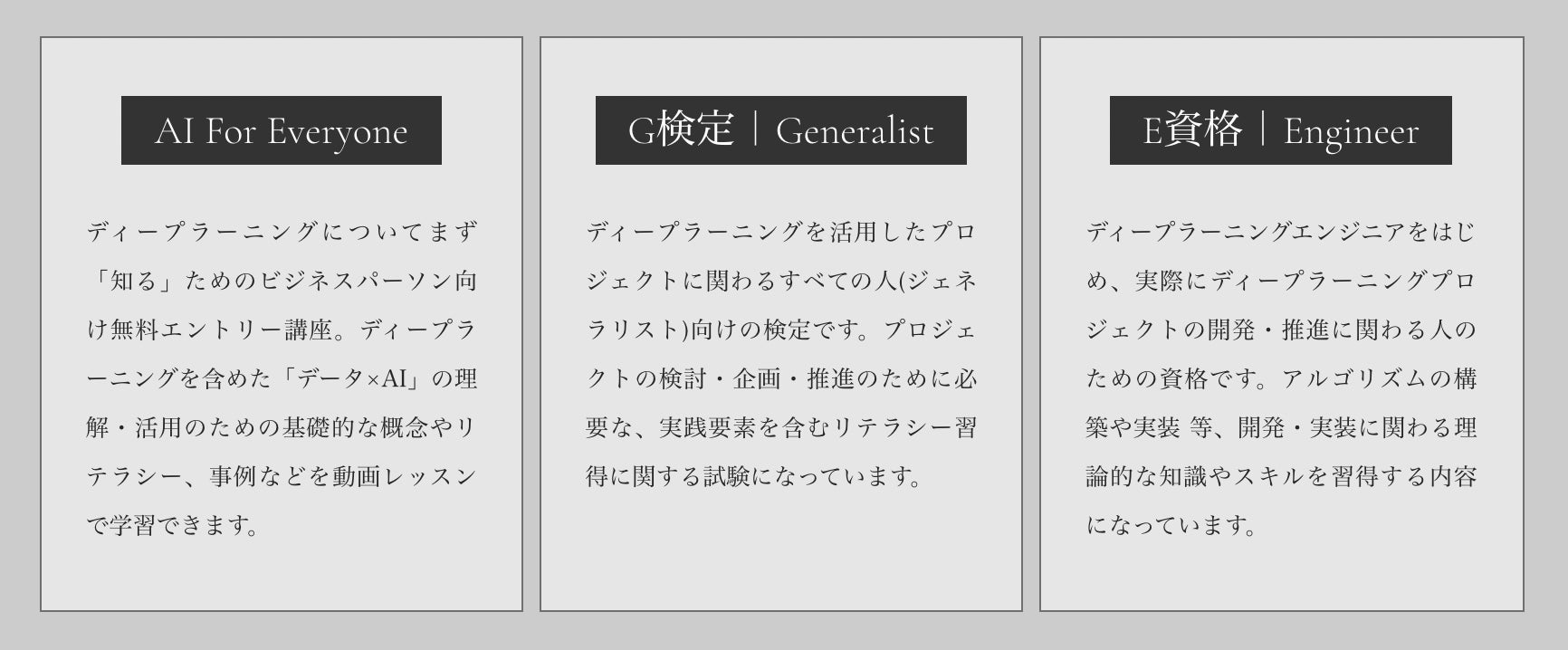 JDLAでは、ディープラーニングの知識を有し「事業活用する人材(ジェネラリスト)」と、「ディープラーニングを実装する人材(エンジニア)」の育成を目指し、下記3つの講座や試験、資格を用意しています。また、JDLA各資格試験の合格者には認定ロゴと合格証の配付のほか、合格者コミュニティ「CDLE(Community of Deep Learning Evangelists)」へご招待しています。