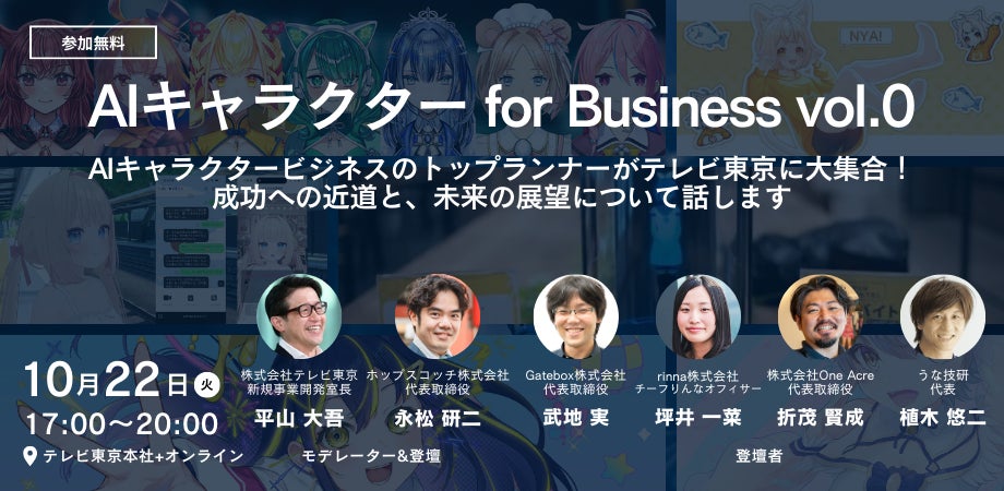 10/22(火)17:00- テレビ東京本社にAIキャラクタービジネスのトップランナーが大集合!登壇者: Gatebox/rinna/One Acre/うな技研 主催: テレビ東京/ホップスコッチ