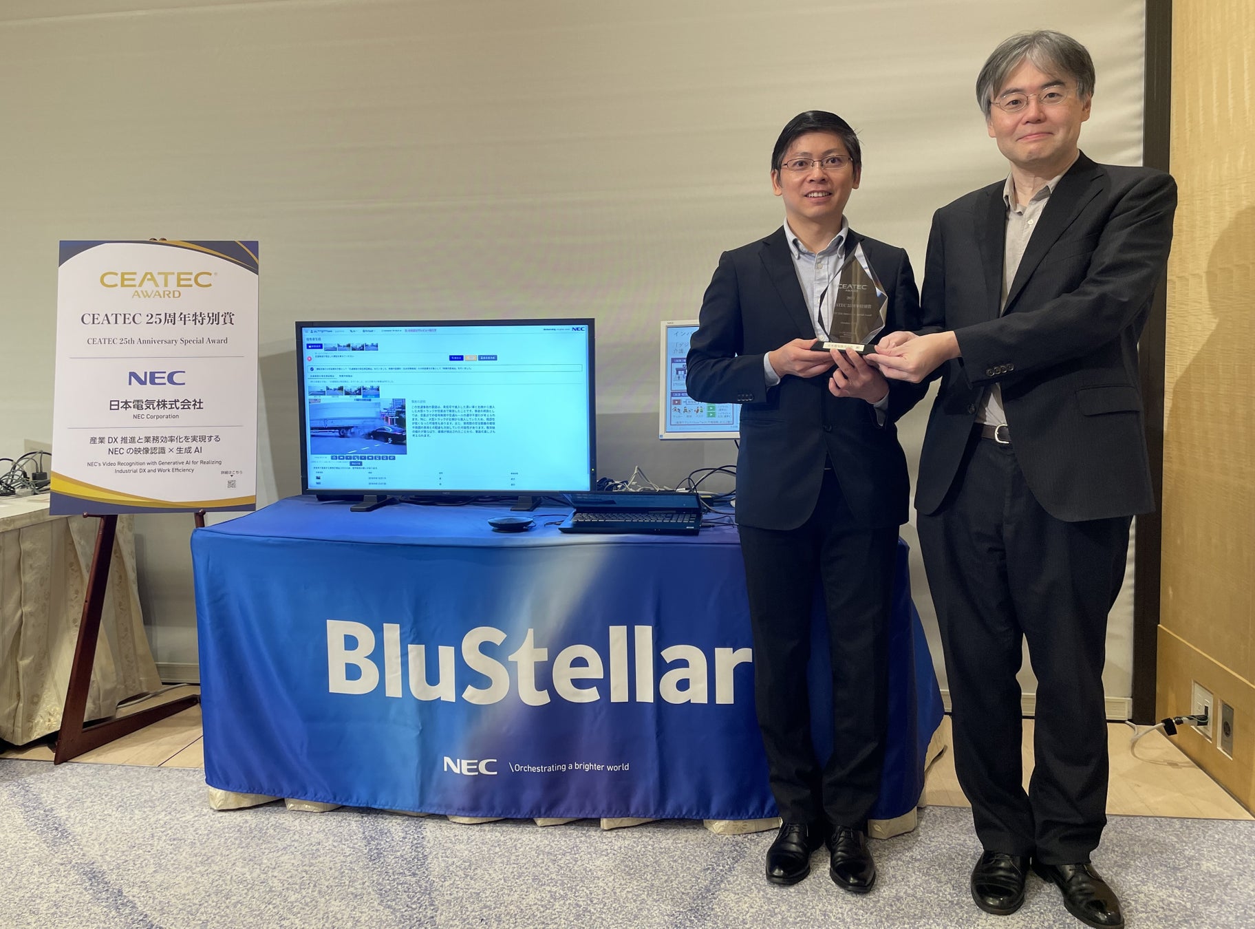 NECは、CEATEC AWARD 2024において「産業DX推進と業務効率化を実現するNECの映像認識×生成AI」にてCEATEC 25周年特別賞を受賞しました。この賞は、CEATEC AWARDに応募されたすべての案件 (グローバル部門を除く) の中から、CEATEC 25周年の特別テーマである「Innovation for All」に相応しく、またその中で、特にAI関連テクノロジーとその活用において優れていると評価された案件に与えられる賞です。