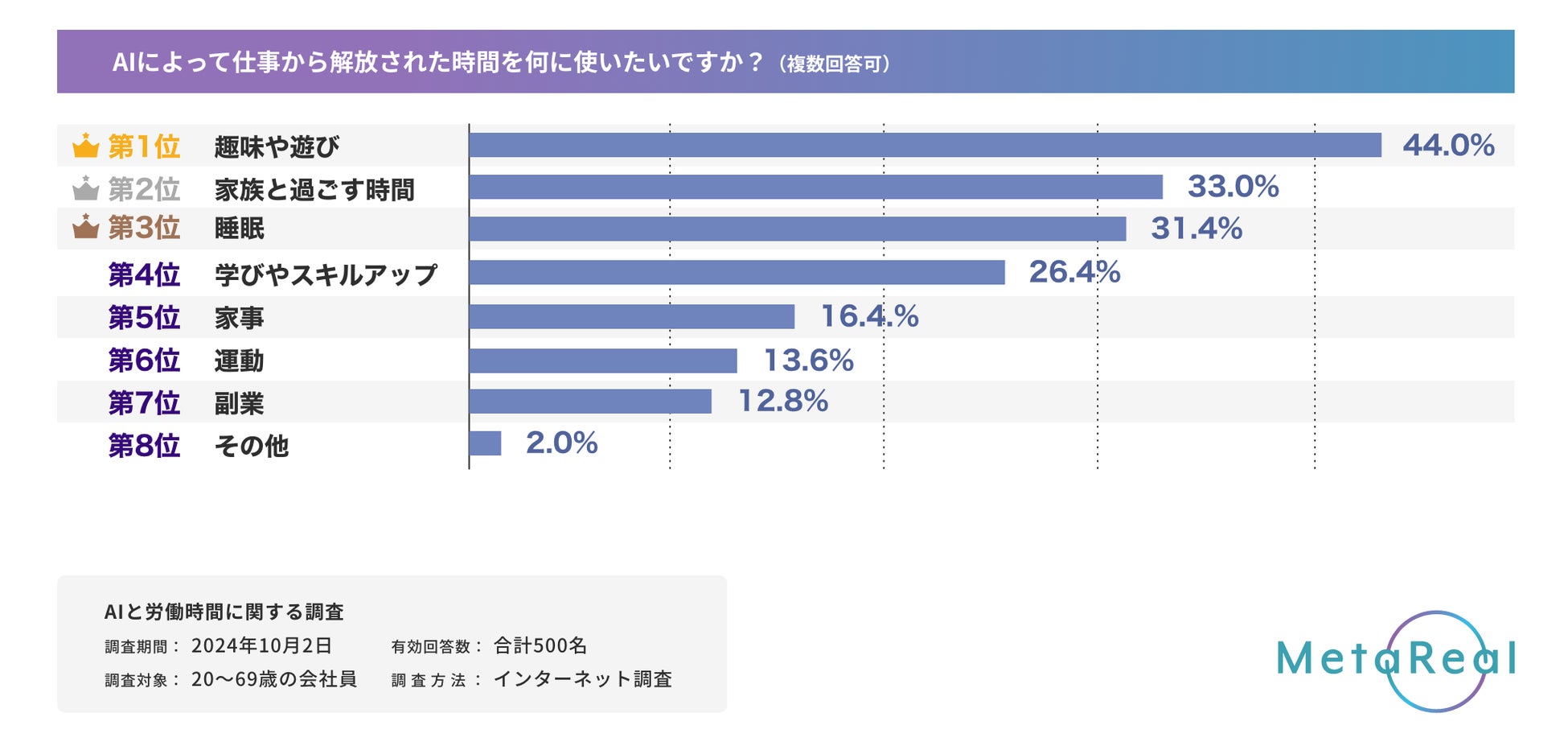 AIの活用によって労働時間が短くなるとしたら、仕事から解放された時間を何に使いたいかについても質問を行ったところ、最も回答が多かったのは「趣味や遊び」(44%)。次いで「家族と過ごす時間」(33%)が支持されました。