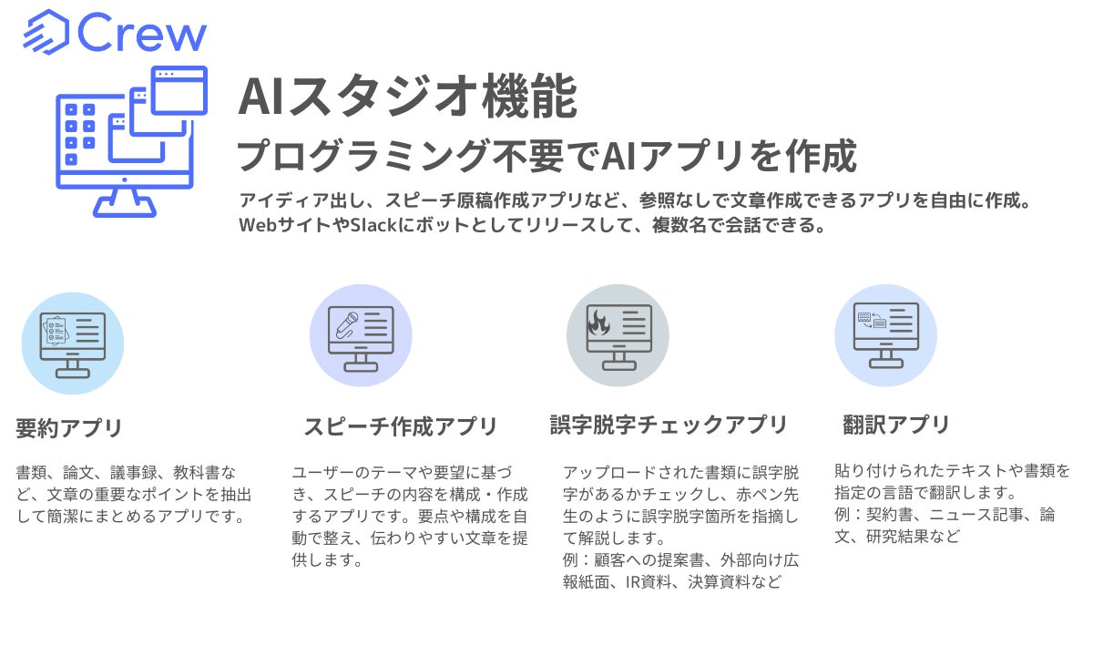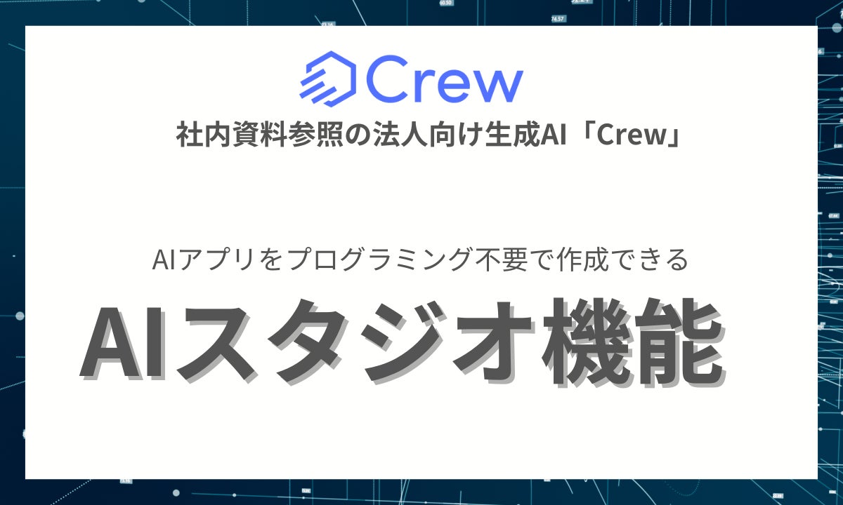 株式会社クラフター(本社:東京都港区、代表取締役社長:小島舞子、以下「クラフター」)は、社内資料参照の法人向け生成AI「Crew(クルー)」を提供しています。この度、新たにAIアプリをプログラミング不要で作成できる「AI スタジオ」機能のサービス提供を開始いたしました。(PRTIMES)