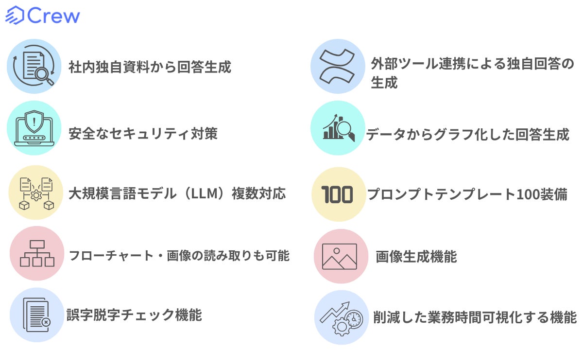 「Crew(クルー)」は社内資料を参照する企業向け安全な生成AIプラットフォームです。企業内にある膨大な独自資料を検索して回答し、従業員の業務効率化と社内FAQチャットボットとして問い合わせ件数を削減します。