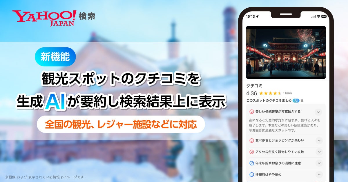 これまで、「Yahoo!検索」では観光スポット名を検索した際に「Yahoo!マップ」などに投稿されている各クチコミを一覧で表示していました。本機能では、生成AIが投稿されているクチコミから、ユーザーの体験や施設に関する評価の高い点、また訪問時に留意すべき点などを抽出し、最大5つの特徴を表示します。本機能は、テーマパーク、スキー場などのレジャー施設や神社・仏閣など日本全国の観光スポット約10,000か所以上に対応しています(※2)。これにより、クチコミをすべて読まなくても、観光スポットの情報や評価が一目で確認でき、年末年始の旅行や初詣などに役立てられます。(PRTIMES)
