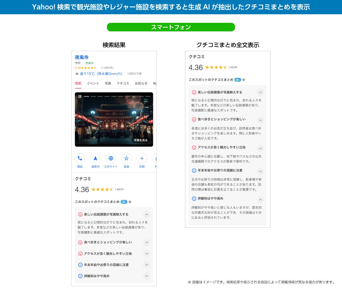 ※1「Yahoo! JAPAN」アプリ(iOS版、Android版)およびブラウザー版「Yahoo! JAPAN」、「LINE」アプリでのweb検索で表示されます。また、クチコミが一定数以上投稿されている観光スポットの検索時にのみ表示されます。