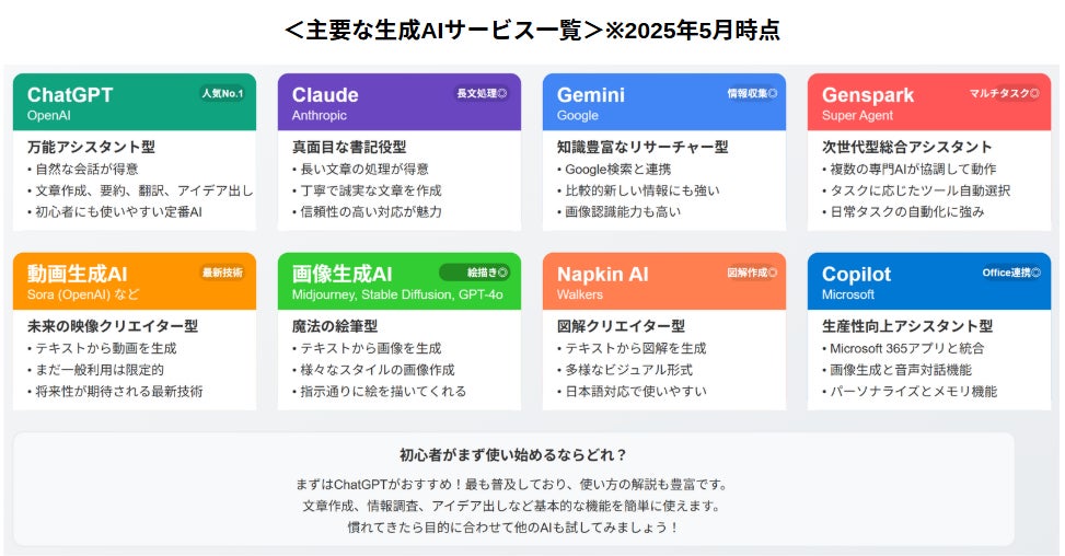本書では、急速に進化する生成AIの世界を、農業従事者の皆様にとって分かりやすく解説します。現在、以下のように様々な特徴を持つ生成AIサービスが登場しています。(下図参照 ※2025年5月時点の情報)