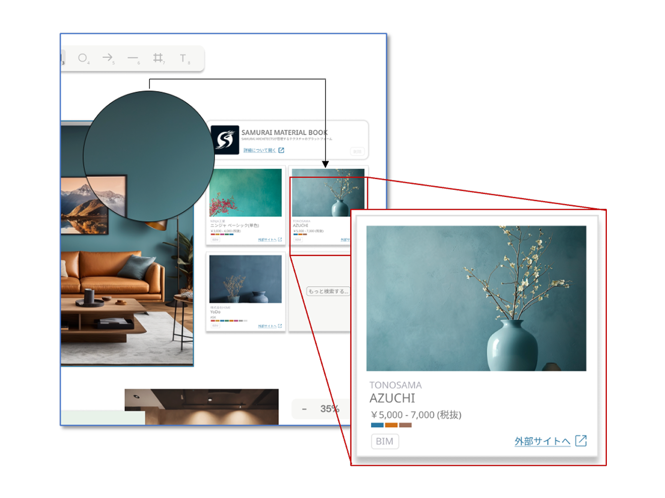 AIが空間写真を解析し、各メーカーの建材データベースと照合。見た目だけでなく、価格・性能・在庫情報に基づく素材提案を実現します。将来的には積算・見積・BIMデータとの連携も視野に、設計からコストマネジメントまでを一貫して支援します。