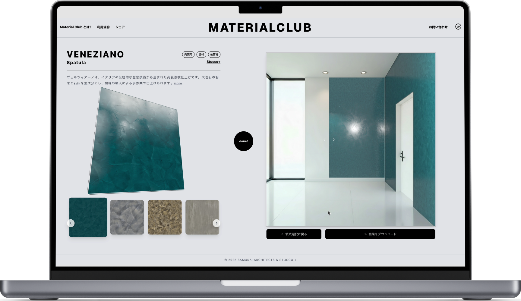 私たちスタッコは、イタリア漆喰を中心とした左官仕上げを国内外で手がけ、これまでに累計100万平米を超える空間を施工してきました。その中で常に感じてきたのは、建築意匠の「最終決定」の難しさです。設計者やお施主様のこだわりを丁寧に共有しながらも、実物サンプルだけでは光の反射や素材のスケール感といった“空間的な質感”を正確に伝えることが極めて難しい——それが長年の実感でした。今回、SAMURAI ARCHITECTSと共同で開発した MATERIAL CLUBは、その課題を根本から解決する可能性を持っています。
