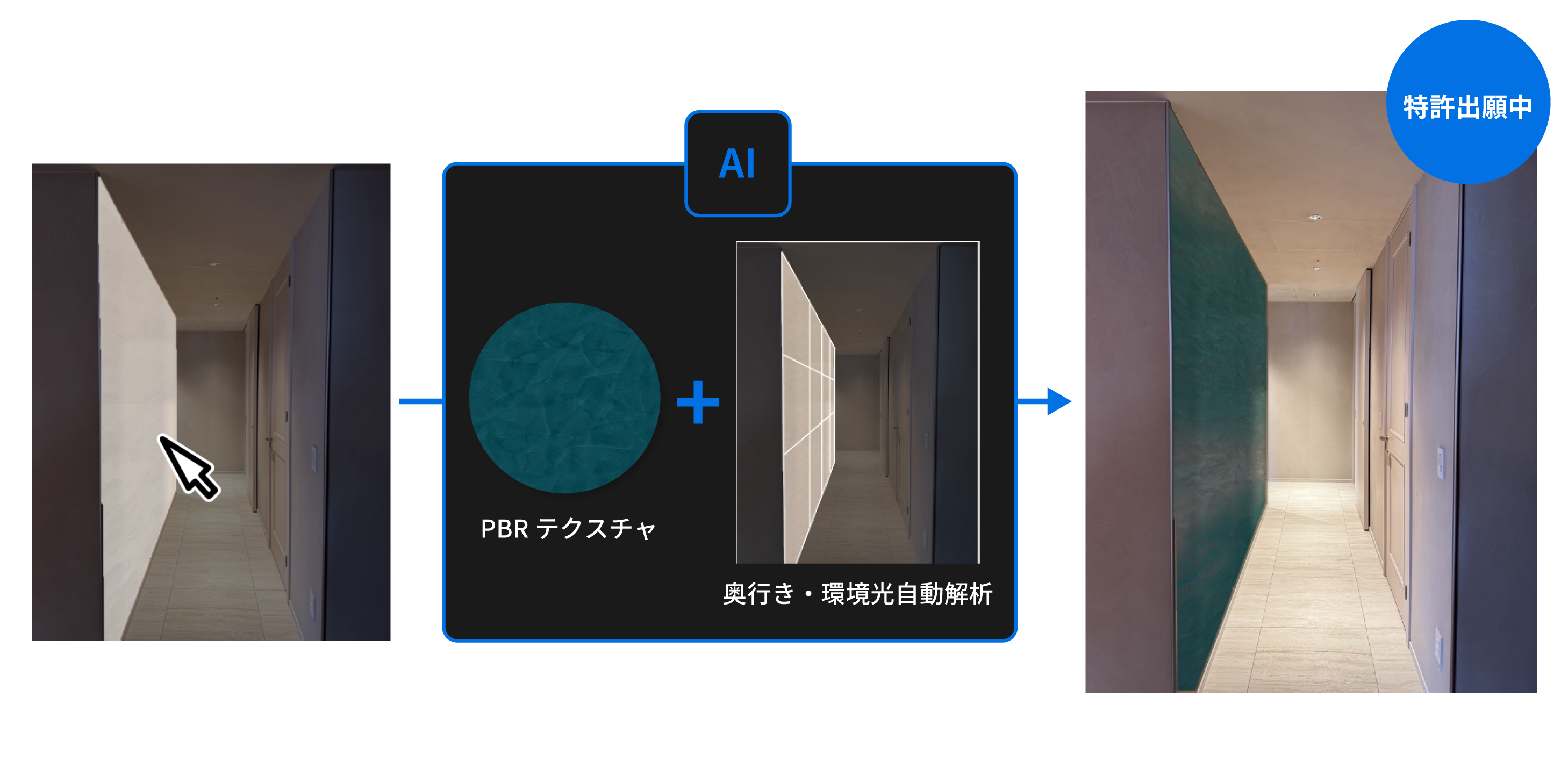 AIが空間画像に素材を自動マッピングし、照明・距離・スケールを補正。設計者・クライアント・施工者が同じ質感のイメージを共有できます。今後はSAMURAI ARCHITECTSの「Rendery」だけでなく、他社の設計・施工システムにもAPIとして展開し、業界横断での利用を目指します。